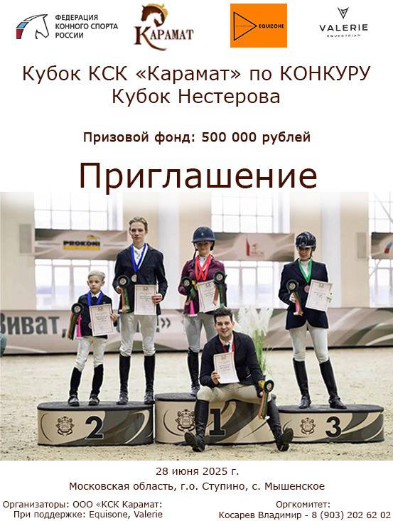 Дорогие друзья! Спешим Вам сообщить, что кубок КСТП «Карамат» по конкуру кубок Нестерова с призовым фондом 500.000₽ стартует в Подмосковье 28 июня в 9:30.