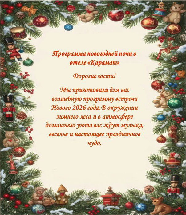 Встретьте Новый 2026 год в отеле «Карамат» — месте, где природа становится частью праздника, а уют и тишина создают идеальную атмосферу.